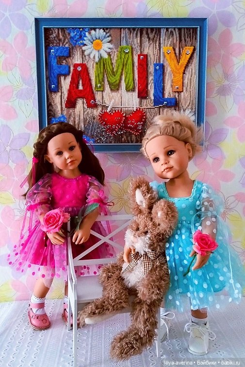 И у нас новенькие платья) и свежее фото с утра) Жаль, нету в хозяйстве у девочек котиков… надо это исправлять немедленно) у мамочки то целая свора--Рыжий Серый Чёрный) Так что фоткаемся с зайцем)