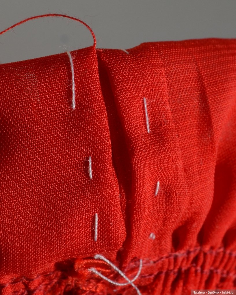 Иголкой сначала прокалывала по сгибу с одной стороны оборки, потом сводила края и точно так же подтягивала второй край. Вечером не поленись, сделаю фото.