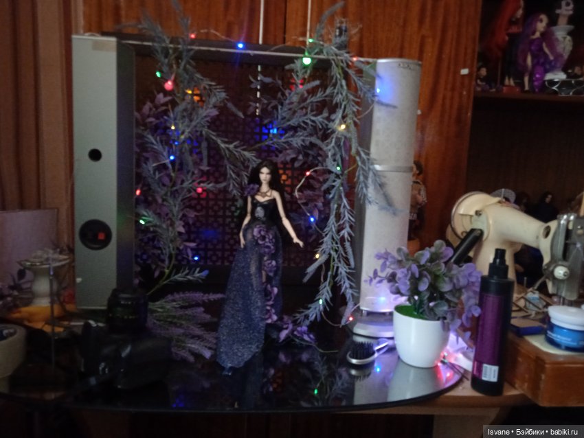 Чтобы куклы сами стояли я чаще всего использую натянутую позади них нитку/леску, ну и когда было больше времени на хобби, то любила ставить кукол без опоры, правда, это ограничивает круг используемых поз, не в любой они будут стоять сами, плюс я фотографирую обычно несколько дней, и все эти дни кукла может стоять в декорациях, ждать, когда у меня появится время на фото. Ещё один бонус использования нити — на неё можно закинуть волосы, одежду для придания эффекта ветерка. Но, конечно, тут нужен опыт работы в фотошопе по убиранию лишнего, я не сразу этому научилась.