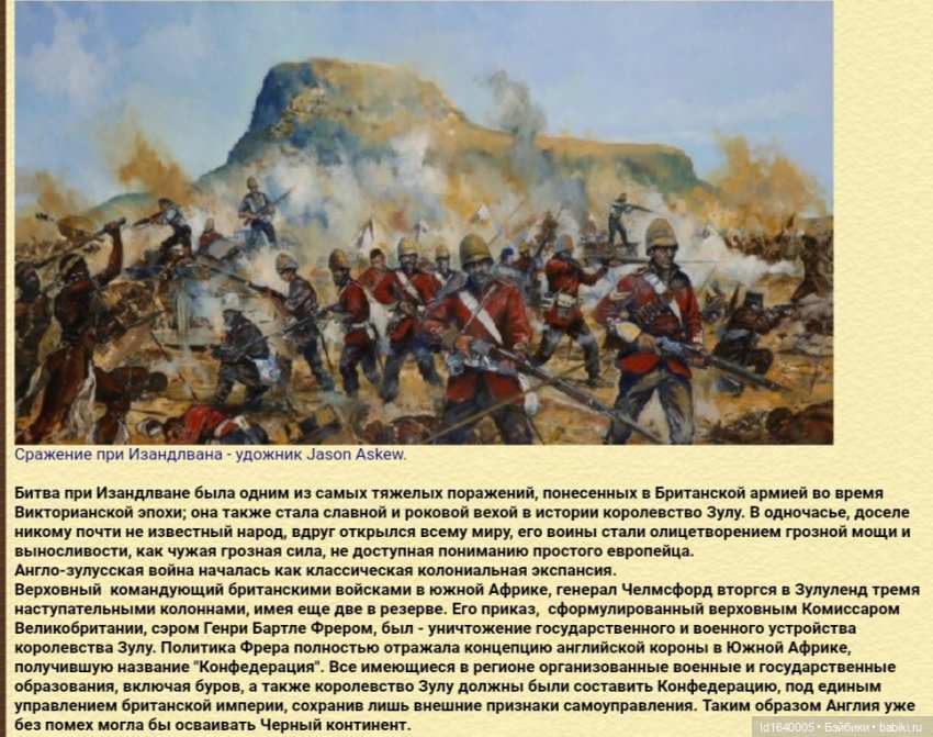 А именно в этом численные силы были равными, примерно по 1,5 тыс., не маленькое сражение. И зулусы, в основном, с пиками и пр., сумели одержать победу. Удивительный же факт, который англичане, вероятно, предпочли бы забыть.