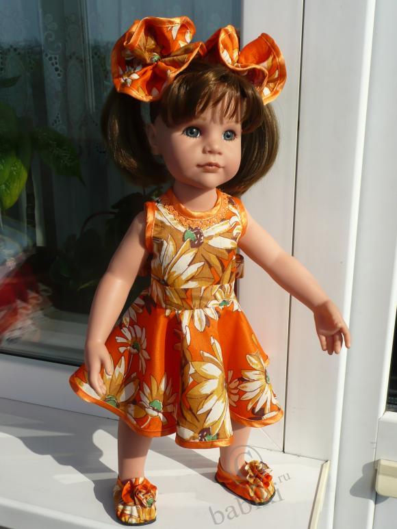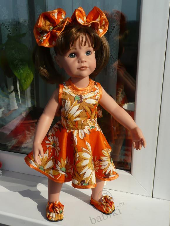 Наряд состоит из платья с юбкой-солнцем, бантиков и туфелек.