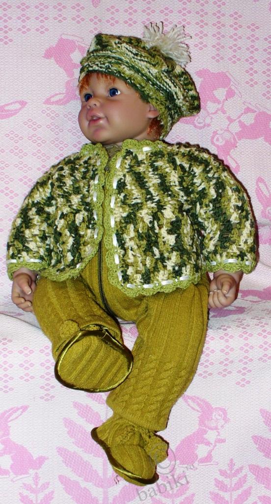 С весны костюм у нас остался, такой оливкового цвета: комбинезончик, чтоб спинка не мерзла и курточка с капюшоном, чтоб в шейку не надуло, даже шапочка( мы уже показывались весной в нем) Сшила из свитера(коллега по работе отдала на переделки для кукол, за что ей отдельное спасибо, относится к моему увлечению с иронией, но ценит рукотворчество).