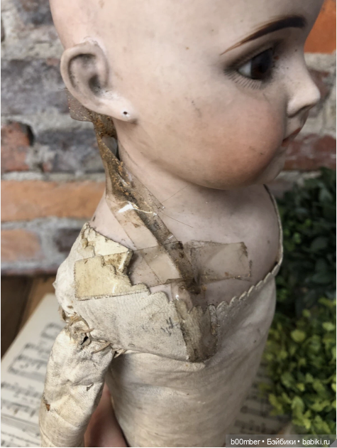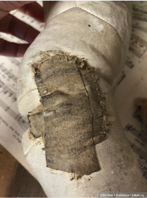 Возни много, и что самое обидное — все серьёзные проблемы кукла заполучила буквально в последнее время, ибо даже скол на плечевой пластине чистый, аки слеза младенца. Заплатка на бедре — современный пластырь, для надёжности посаженный на клей а-ля «момент». А под ним даже не прореха, а дырка 6х5 см. Такое ощущение, что кто-то тупо вырезал кусок кожи с бедра. В общем, сплошное издевательство над ребёнком. Два дня только отмывала и убирала скотч. Уже склеила плечевую, укрепила воском глаза, один глазик заполировала, т.к. была небольшая царапина. Сейчас голова с плечевой выглядят так: