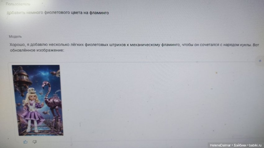 Бодаюсь с ИИ насчёт фонов: он упорно пририсовывает ноги, если на моем фото кукла на 2/3. Не терпит он куколок без ног :))) приходится несколько раз наседать, чтобы оставил исходное фото.