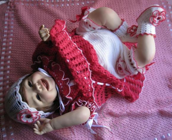 — довязался новый наряд для Ванессы. По-моему, ей нравится. А вы что скажете? Как вам кажется, красный на ребенке — это очень вызывающе? Его не слишком много? А то же мы привыкли к постельным тонам. А так захотелось чего-то яркого мазюкнуть!!!