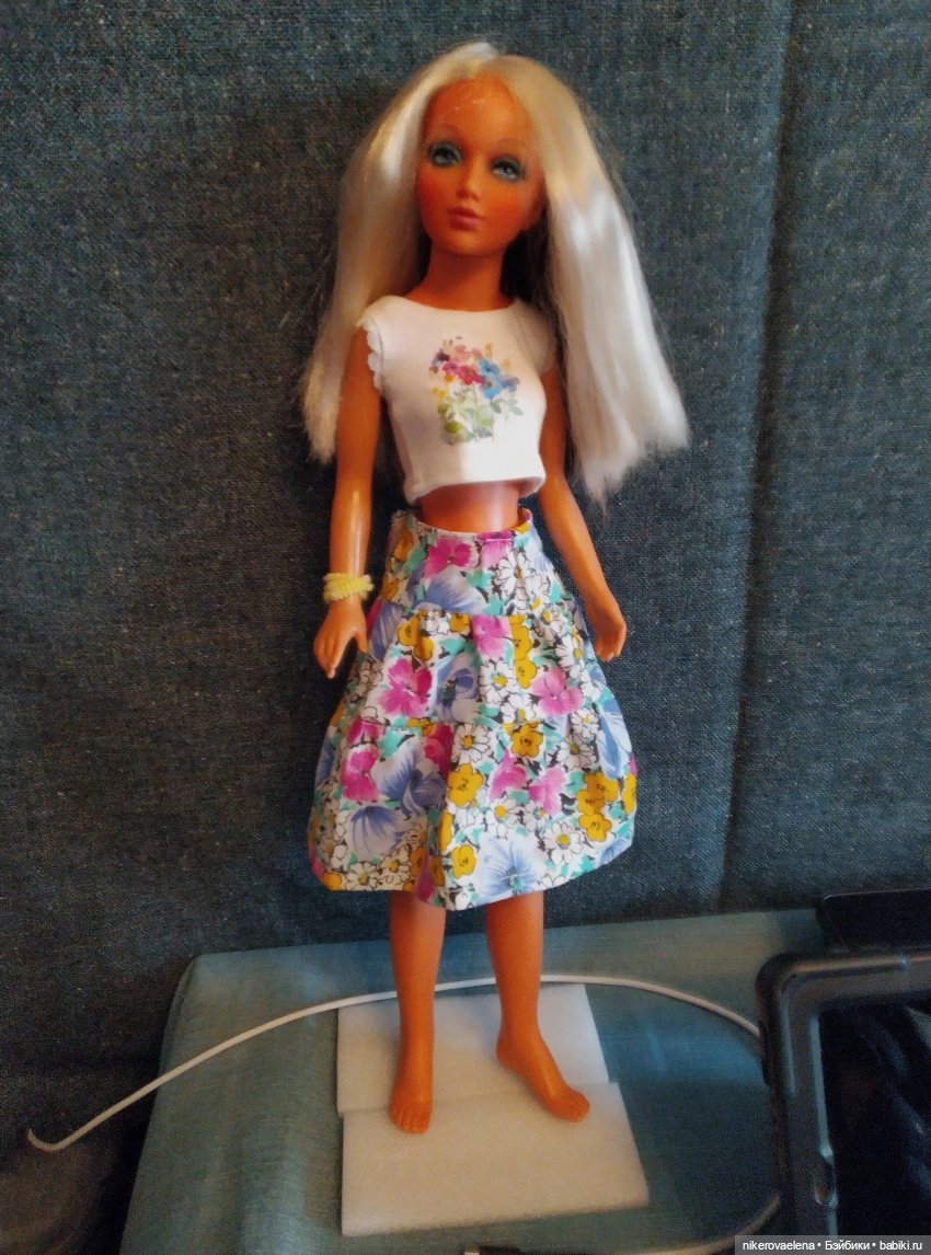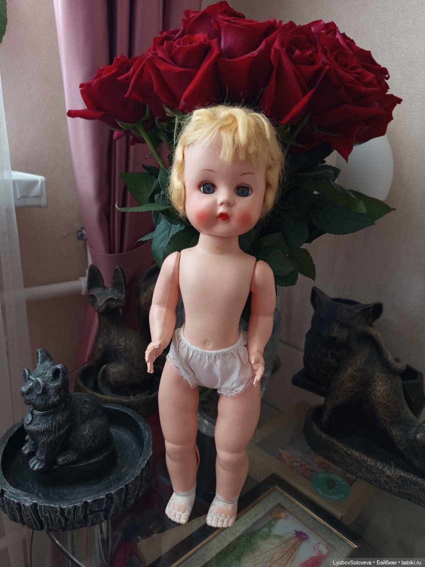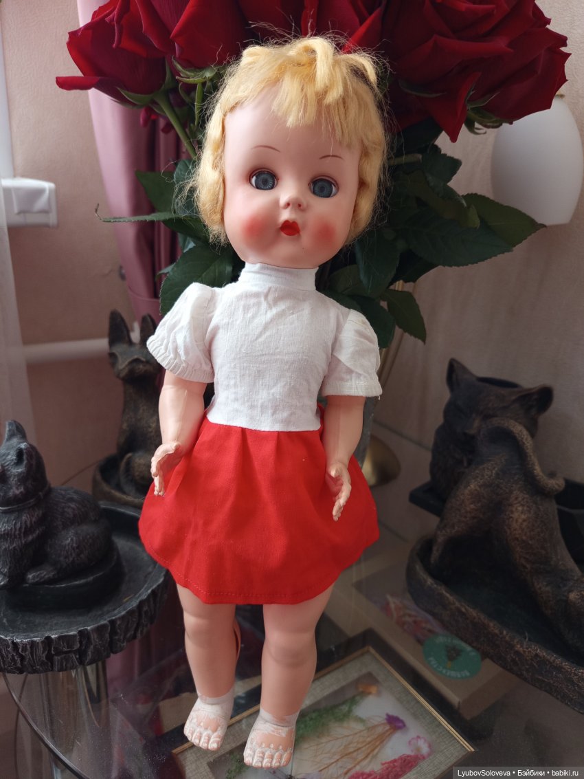 Есть одна невероятно нестандартная для меня кукла. Под 50 см ростом. Американка, фирма «Идеал» выпускала. Стоит на виду, слегка одета, но подбор. Даже где-то нахапанные именно на нее выкройки имеются. Тоже американские.