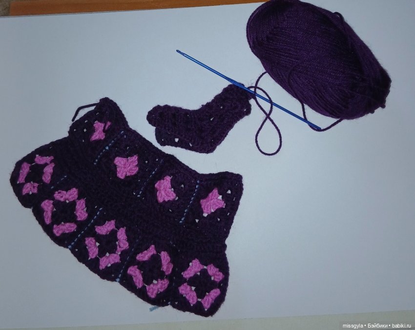 А у нас готовы два предмета: юбочка и блузка, а вот третий пока еще на середине.