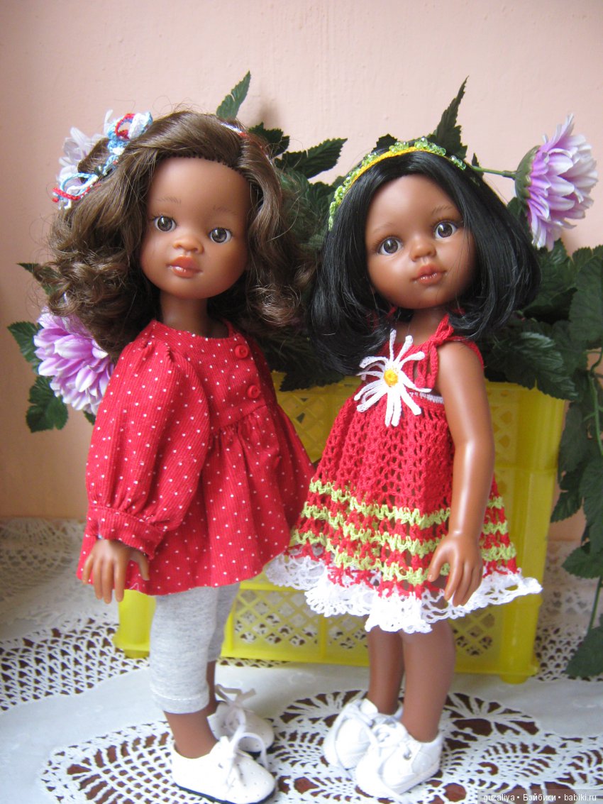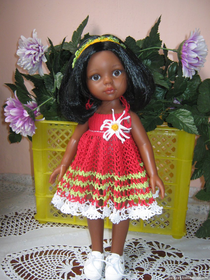 Скромница Дашенька взяла себе красный сарафанчик и уже постояв в нем на полке, придумала украсить его цветами… забавно, как та или иная кукла предлагает свои идеи :)