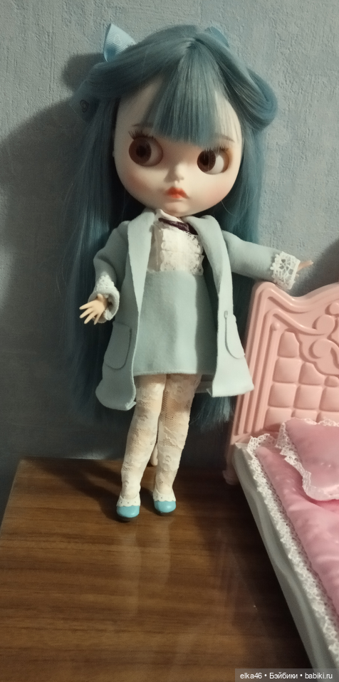 И последний аутфит, от Лены. Про гольфы мы забыли, а трусики также не налезли, но под платьем этого не видно :) Шапка тоже не налезла толком — исключительно из-за причёски. Думаю, что на сяоми-блондинку эта шапочка сядет хорошо, но мне уже лень было идти и проверять.