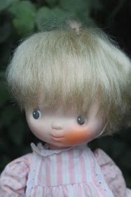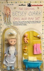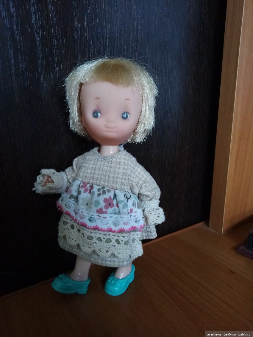 Малышка в шапке поросёнка достаточно интересная. Я может когда-нибудь про этих кукол топик сделаю. Зовут её Бетси Кларк. Так звали художницу, которая рисовала таких деток. Детки на её картинках были в заплатанной одежде, грустные. За это Бетси Кларк несколько раз исключали из художественного училища, но в 1962 году она получила лицензию от Hallmark. Ее искусство стало очень популярно в 1970-х годах: оно появлялось на рождественских украшениях, оберточной бумаге, книгах, табличках, пазлах и, конечно же, куклы. Куклы были и мягконабивные и маленькие, как у меня. Маленькие продавались с игровыми наборами. И те, и другие сейчас можно найти на ибей.