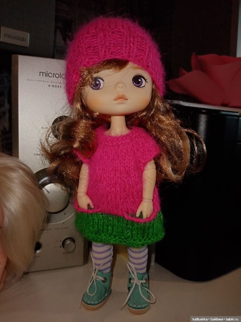 И маленькая ложка дёгтя у почти идеальной куклы — очень тяжёлая голова. Куколка в обуви сама прекрасно умеет стоять, но не умеет сидеть без опоры. Если садить без опоры, то надо поддерживать за ногу, иначе кукла кренится назад.