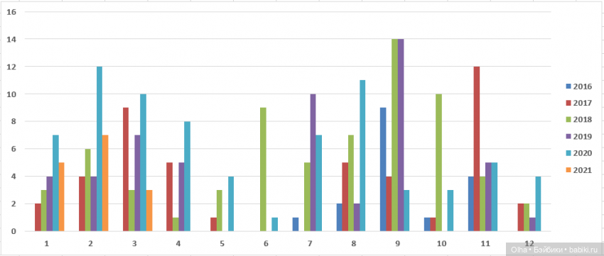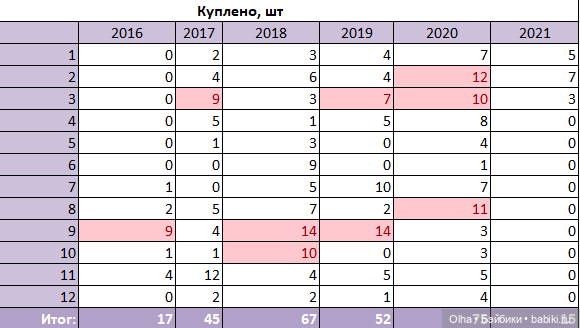 Ну с детства с 1991 года и по 2015, когда я только пришла в хобби, у меня всего 9 кукол, поэтому я их объединила в один столбик. А вот, если проследить цифры дальше по годам, то видно, что лично у меня шиза наступает примерно каждый раз в сентябре-октябре