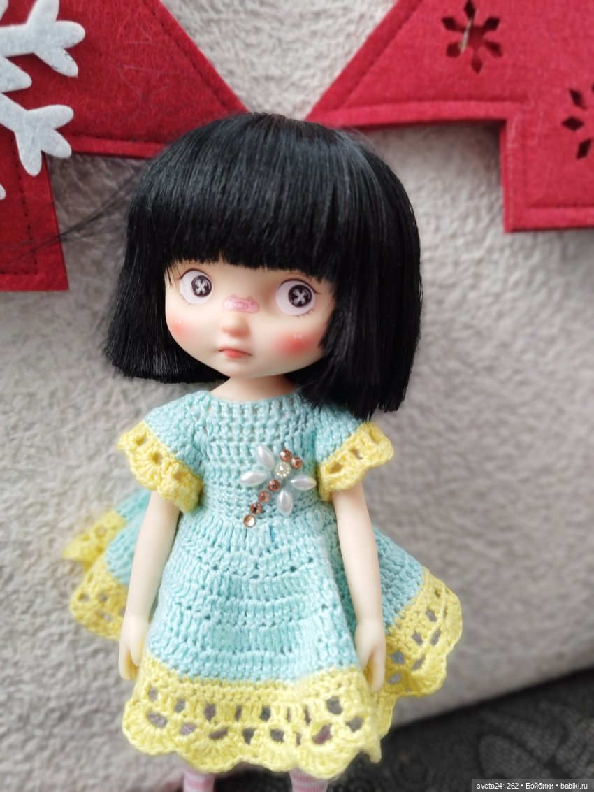 А коробочка — да, тоже в пути помялась. Хорошо, что сама куколка не пострадала. Тут уж или производителю нужно подумать о более крепкой коробке, или продавцу, который непосредственно отправляет куколку, более надёжно её упаковывать в дорогу.