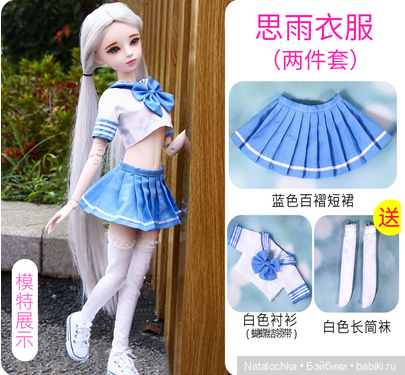 №17).Наряд «Морской»(блузка бело-голубая, юбка голубая, гольфы). Цена 1690 руб.