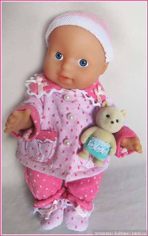 Вчера я его получила. Вживую он гораздо милее, чем на фото. Но платье, бывшее на нем при ближайшем рассмотрении оказалось носком с веревочкой и было безжалостно выброшено. Было решено шить гардероб. Легко сказать — труднее оказалось сделать. Пол дня проковырялась. Результат на ваш суд: