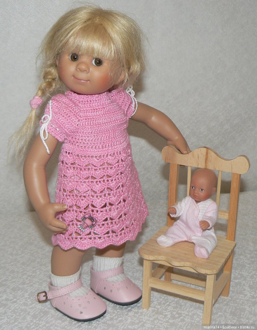 Я связала ей платье со складками из мохера цвета зелёного яблока, за которое выражаю просто огромную благодарность Елене (JelenaV1962). Очень мне понравились эти складочки!, поэтому я связала с ними сразу ещё одно платье для Евы- блондинки.