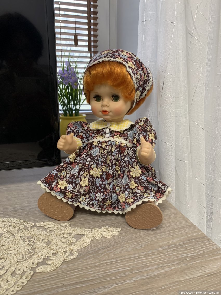 На этой фотографии видно, какая она была изначально на Непослушной Аленке (розовое платье) и рыжике (костюм с чередой оранжевых и белых ромбов).
