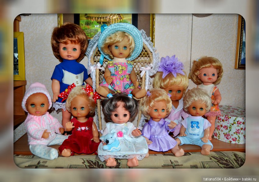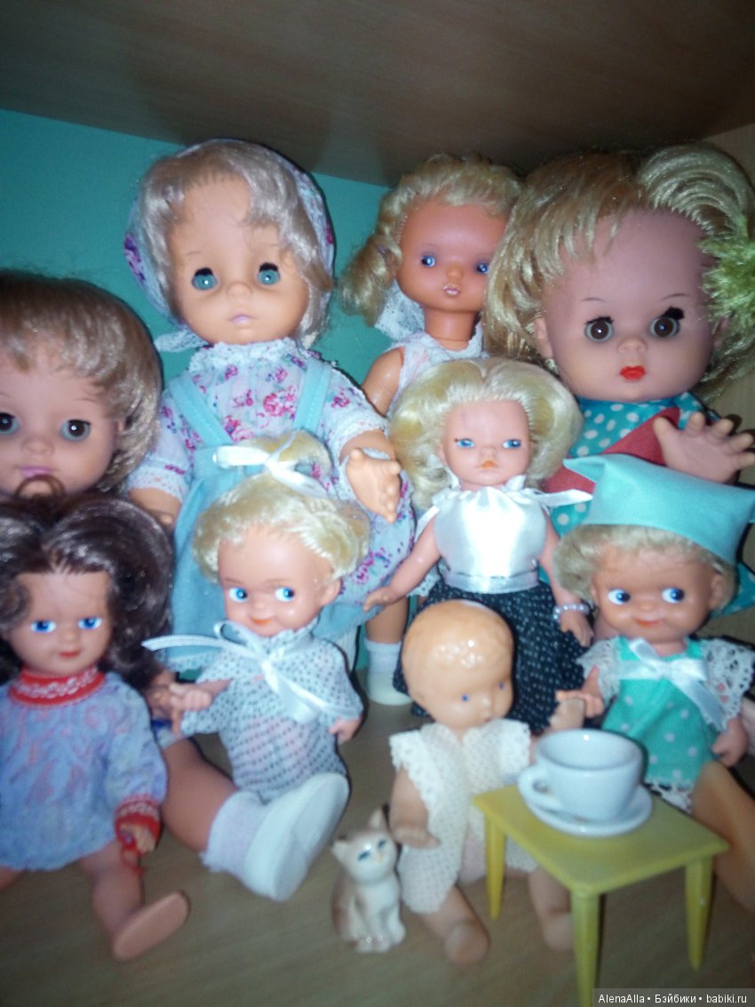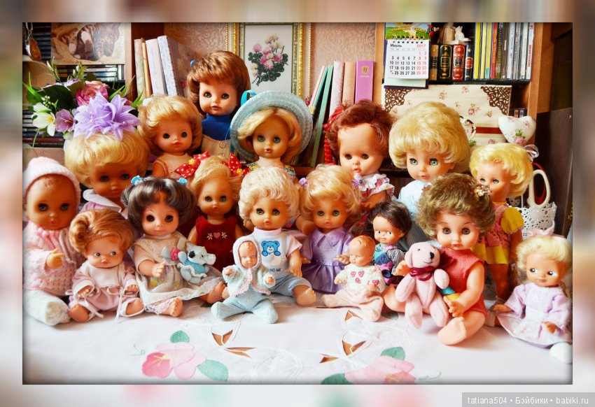 Мы в гости небольшой компанией. Лично моя кукла, из моего детства, на фото одна, только она сохранилась у меня — Юлька. Малышка слева, на переднем плане. К сожалению, она «заболела» чёрными пятнами(