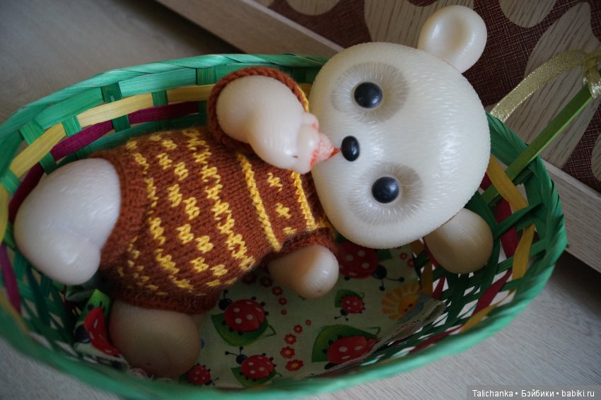 А вот мой потеряшка Мишутка))) уже нарядный и с собственной колыбелькой) обожаю его сил нет!!! В моё детство он мог любой кукле хвастануть своим шикарным гардеробом! Все у него было от белья до верхней одежды))