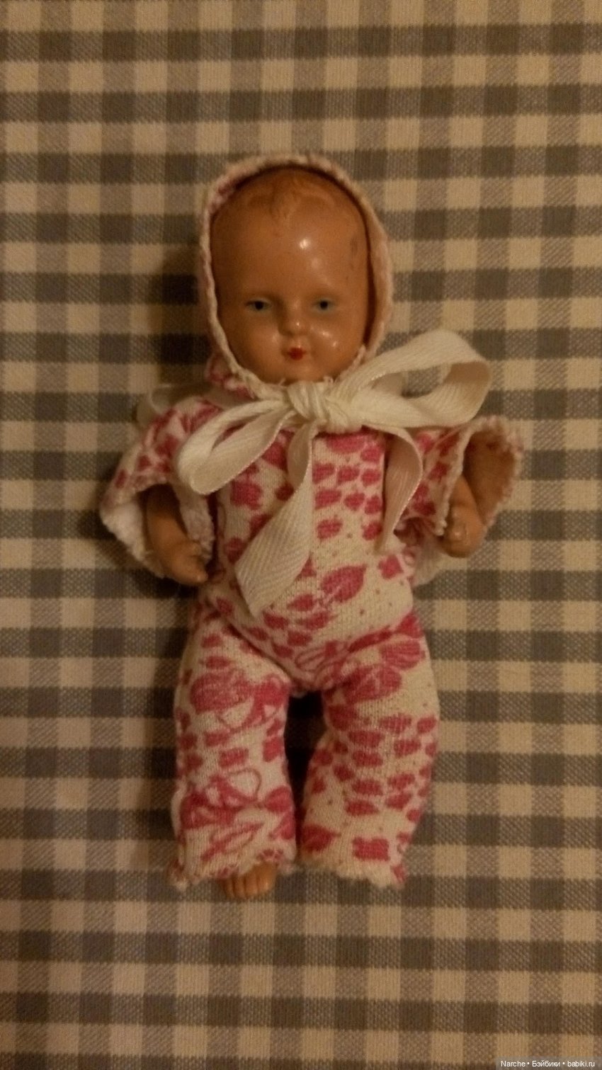 У меня тоже есть подобная керамическая малышка, но она покрупнее, наверное, 12 см. Костюмчик, вероятно, был сшит прежним владельцем.