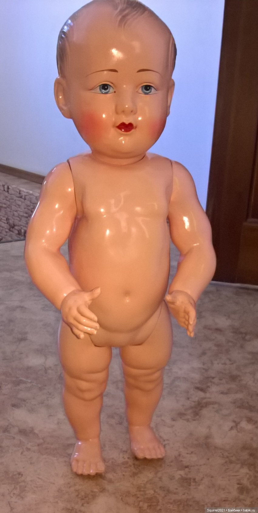 Третий малыш фабрики snf. «Сын полка»)). Немного с грустинкой в глазах. Полностью целлулоидный. Клеймо в виде треугольника с буквами snf внутри.