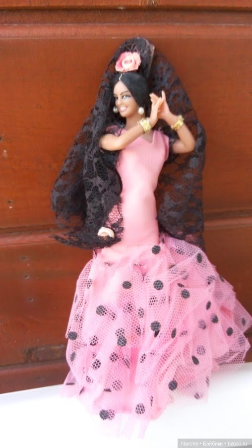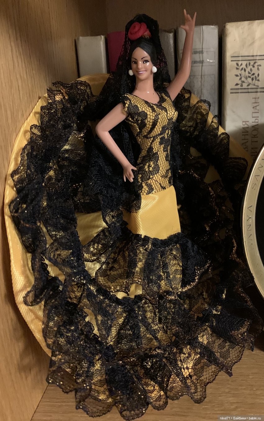 Одежда не съемная, по-этому мне пришлось стирать платье прямо на куколке. Привела ее в порядок, сделала колечко, брошку, подновила ей маникюр, глазки и брови и даже туфельки. Испанка очень детализированная, изящная и ростом всего 16 см