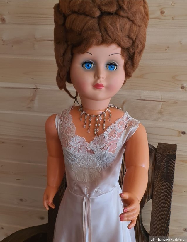 Еще есть огромная ярмарочная, которая в плохом состоянии, и пока мне не удалось ее починить. В связи с чем хочу предупредить, у этих кукол парик мочить нельзя, у меня он растворился и утек в трубу. А под париком обнаружилась итальянская газета 74 года с молодой Софи Лорен.