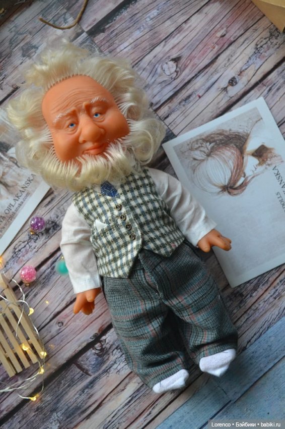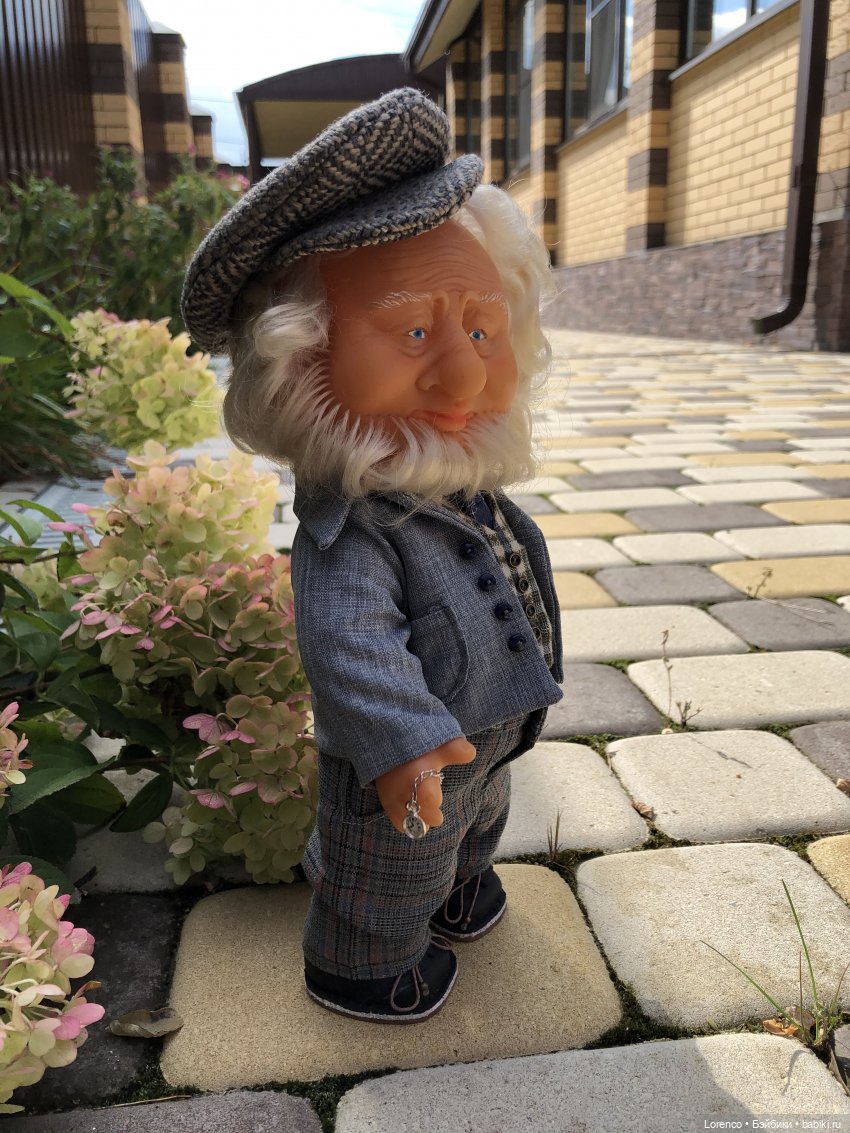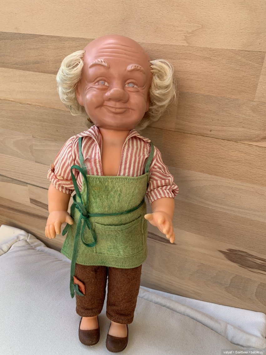 Вот несколько фото его комплекции, он очень интересный! Рост у него около 30 см, он действительно крупнее того, рыжего, но выражением лица мне кажется они похожи по крайней мере одно из них явно лепили по образу второго. Одежда прекрасная даже после стольких лет. На ногах были пластиковые туфли коричневого цвета, но пластик был таким хрупким, что когда я их снимала появилось несколько трещин. В кадр не попали т.к. я убрала их в пакетик и забыла куда…