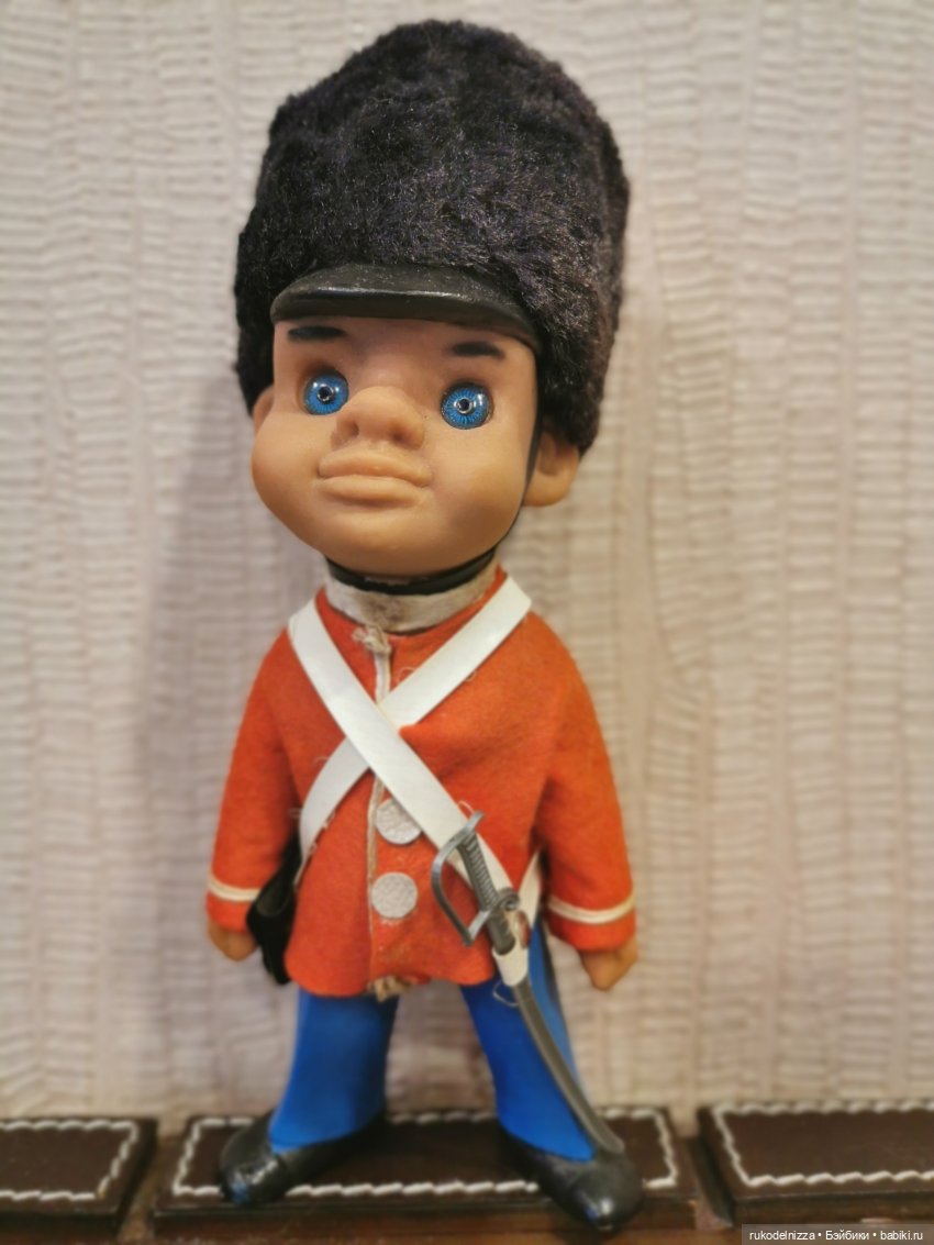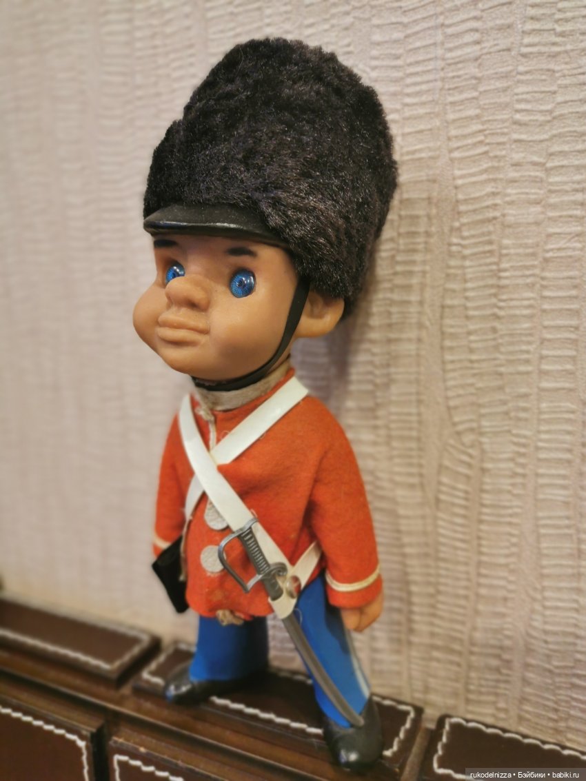Сегодня приобрела вот таких прикольных винтажек). В раздел Коллекционные поставила потому, что кукла, которой, собственно, и посвящён топик, явно не игровая. Наверное, когда-то она продавалась как памятный сувенир. Для тех, кто коллекционирует кукол тех стран, которые посетил. Не могу с уверенностью сказать, чья форма одета на этом бравом военном. Швейцария? Великобритания?