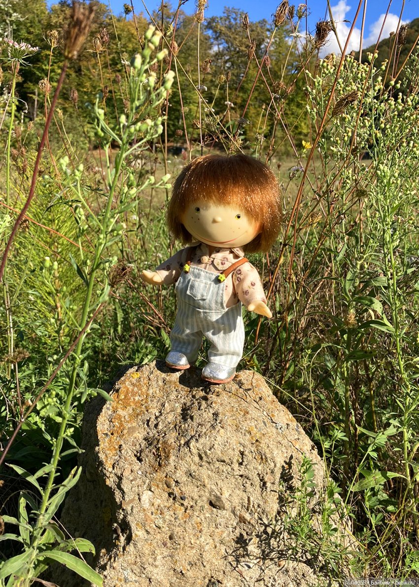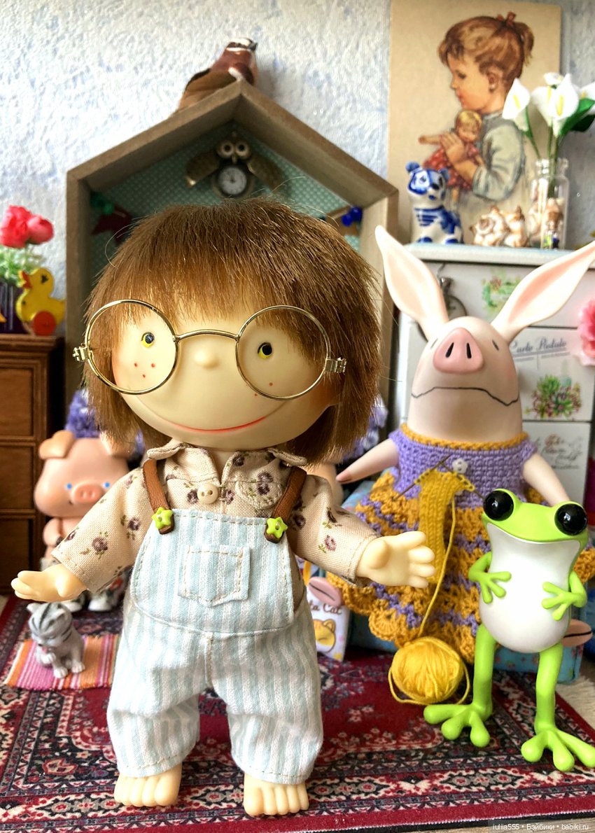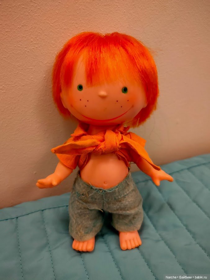 Винтажный куклоребенок японского производства с улыбкой от уха до уха, любимого рыжего окраса, любимого небольшого размера — вот малый перечень неоспоримых достоинств этого малыша) Приехал в платьице, но категорически не вижу в куклёныше девчонку) Решено было еще до покупки — будет парнишкой! Надо шить штаны да рубахи, а то в наличии только костюм-тройка: очки, трусы, тапки))