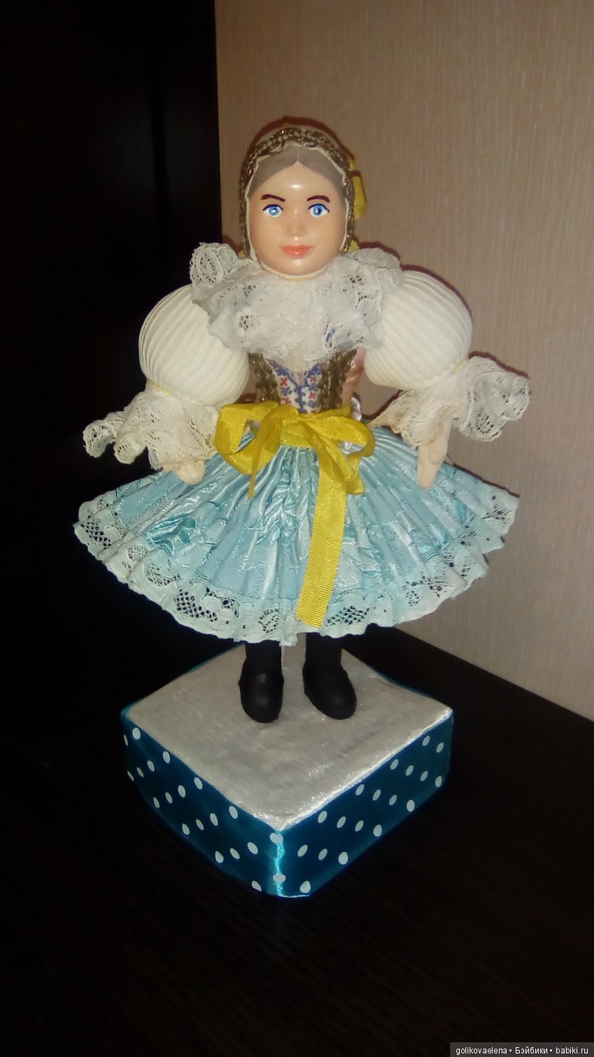 Когда произведена куколка — точно я так и не смогла определить, но косвенно, по состоянию элементов одежки, можно предположить 70е годы. Выпустило ее товарищество LIDOVÁ TVORBA в городе Uherský Brod. Товарищество было основано в 1936 году, и специализируется как раз на выпуске кукол в традиционных чешских костюмах разных земель.