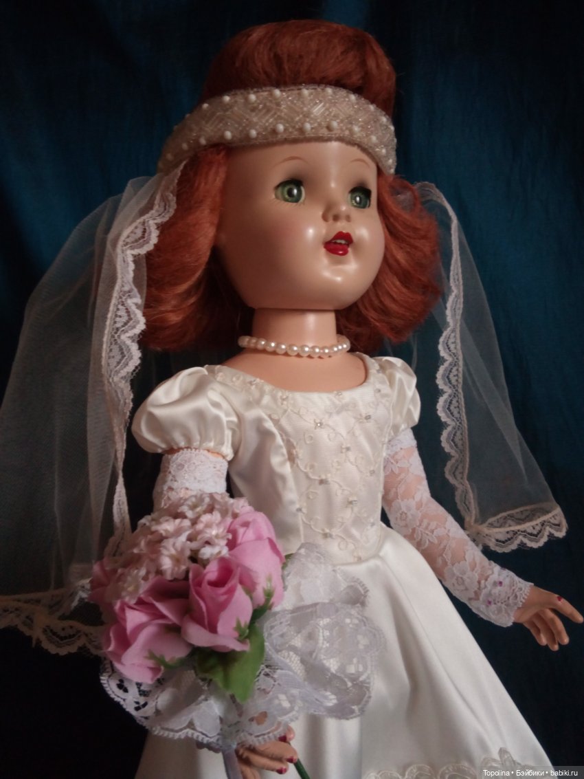 Здравствуйте, друзья! А у меня новая американочка, 50-х годов, из хардпластика. Спасибо, Лариса 89276334996 ! Длинноногая стройная красотка, рост 44 см (17 дюймов), шагающая. Немаркирована, только на спине значится «made in u.s.a». Кукла называется Sally Walker, но я её зову Алисой. Кстати, у нас в шопике я нашла такую же куклу, с другой прической, но рост и молд такой же. Паричок, изначально не густой, совсем поплохел после мытья, а при расчесывания выдралась прядь волос, ибо марля, на которую настрочены волосы, расползлась от возраста. Пришлось на полоску ткани настрачивать и вручную пришивать, формируя пробор, как на паричках той эпохи. Сшила девушке три платья, нижнюю фатиновую юбку и туфельки. Мы готовы показаться, и ждём родственников в гости! Спасибо за внимание!