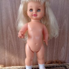 Маленькая шагающая кукла на батарейках, рост — 28 см, тело и ноги пластик, голова и руки резиновые, сапожки пластиковые, не снимаются. На глазах две реснички.
