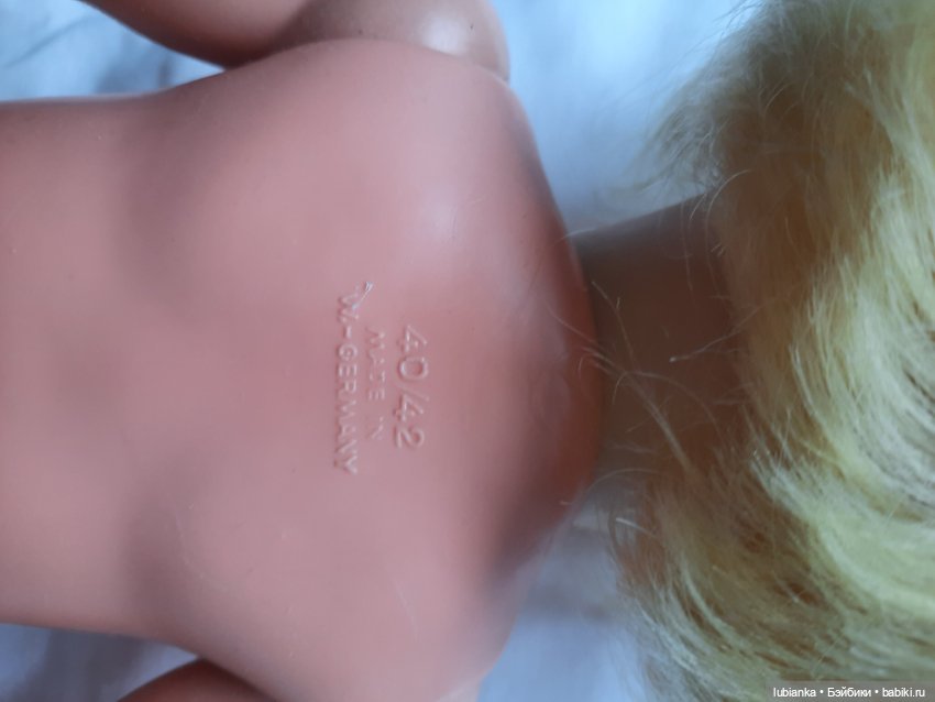 Немного похожую нашла я летом в кукольном секонде в Зальцбурге. Маркировка имеется только на спине — Made in West Germany. Интересно, что у меня уже живет кукла с абсолютно точно таким же тортулоновым телом и виниловой головой. На спине тоже Made in West Germany, а вот на затылке — Шильдкротовская черепашка.