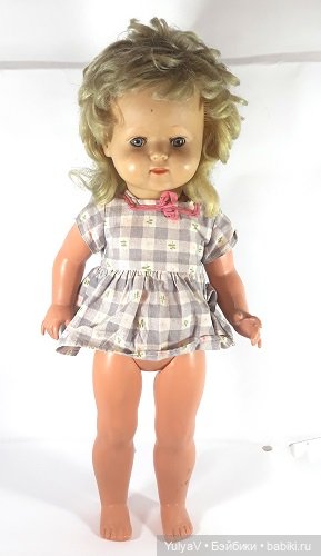 То ли это целлулоид, то ли тортулон-не знаю.Плаксон плачет-меня всегда это обескураживает: такая взрослая дама и плачет! Кукла тяжёлая из-за этого тяжёлого плаксона и головы, а тело с руками и ногами очень даже лёгкие-вот такая необычная странность)Смотреть на неё можно долго и молча… как на антикварок… Наверное, это 50е гг-клеймо на спине странное и на шее раннее тоже.Может, кто из вас что-то поподробнее расскажет о её годе рождения???