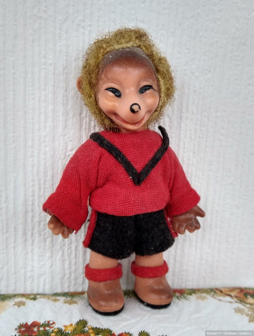Ежиков таких я обожаю! В детстве, это, значит, вторая половина 70-х, у меня было два таких. Один в костюме капитана, а другой просто в мужской одежде. Они не сохранились. Интересно, что у тех внутри резинового тельца была проволока. А у этого ежа ее нет.