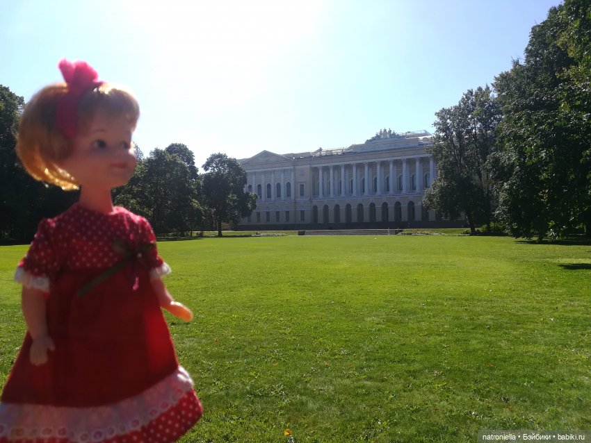 Эта поездка в Питер была почти спонтанным подарком на мой день рождения. В рамках борьбы с извечным «а что люди подумают?» я взяла с собой куклу. Маленькую (потому что «а что люди подумают?»). Я постеснялась выпустить ее из сумки в Кронштадте, не повезла в Сестрорецк и ленинские места, не гуляла с ней вдоль берега Финского залива. Но, в полном соответствии с непостижимостью женской натуры, выгуляла ее в Эрмитаже — чуть ли не самом людном месте Санкт-Петербурга!