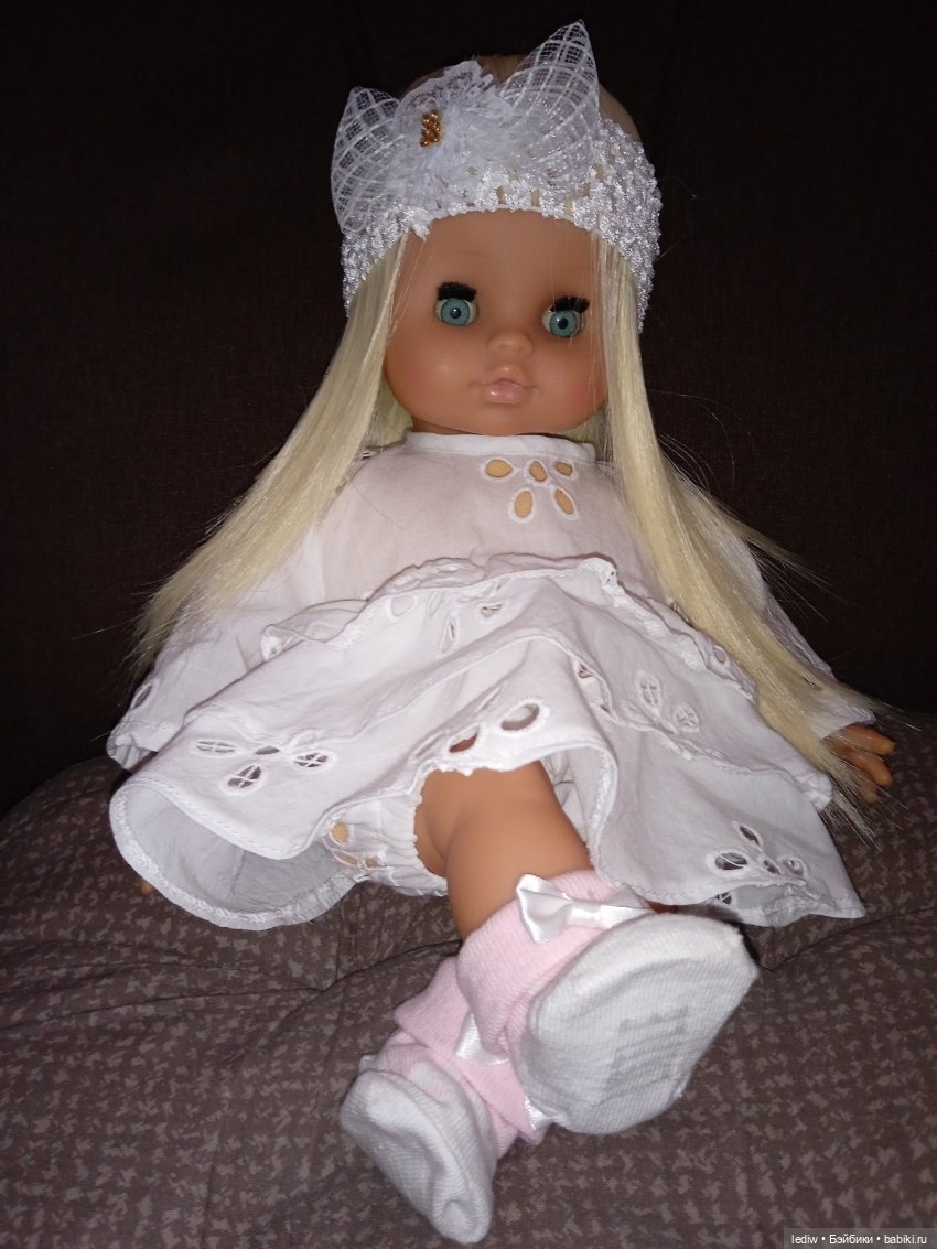 Приехала она ко мне в родном пакете, абсолютно новая. Чистая, без запаха. Родной костюм из ситца я сняла и переодела её в свое. Ходила вокруг неё несколько дней, не могла поверить, что это правда. Иногда укладывала её спать, очень интересно было, как глазки закрываются. Многие уже отвыкли от этого, ведь у большинства кукол глаза не моргают( Достала ей компанию из лучших игрушек и сделала бантик на магните. Куколка довольно большая и крупная, но не тяжелая.