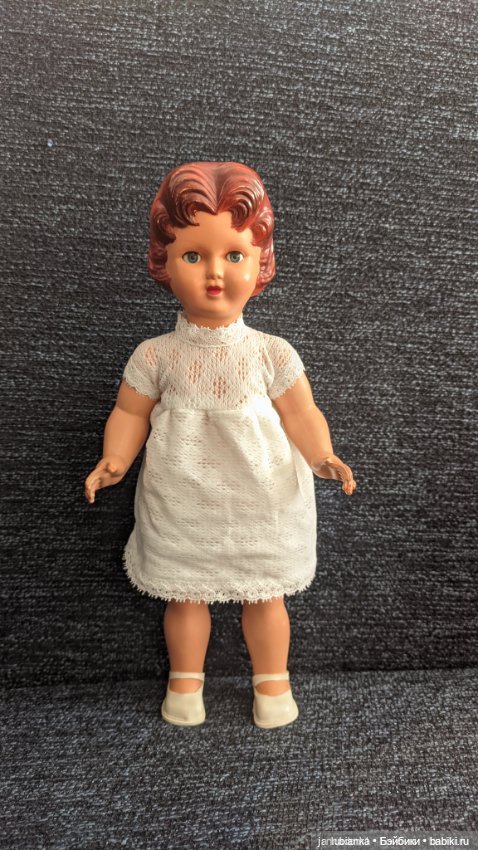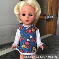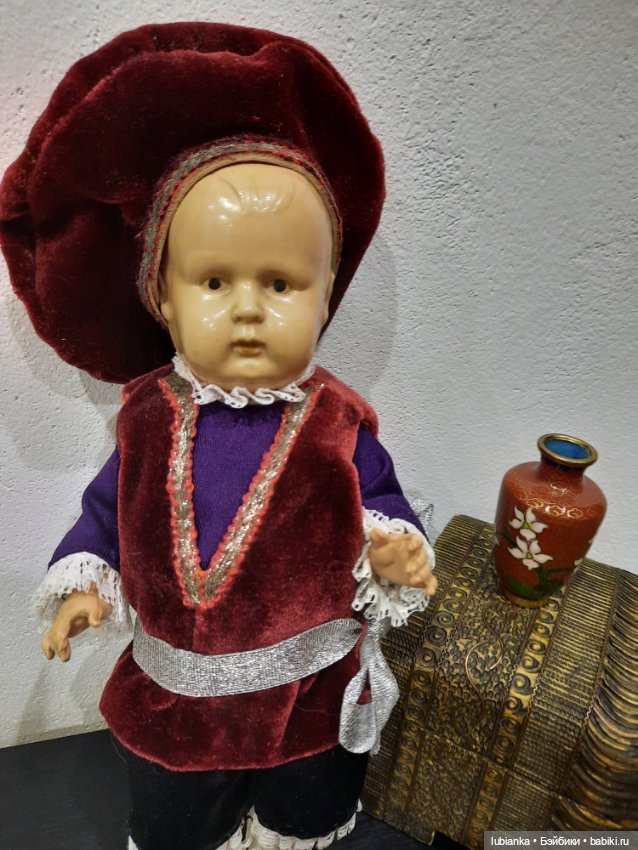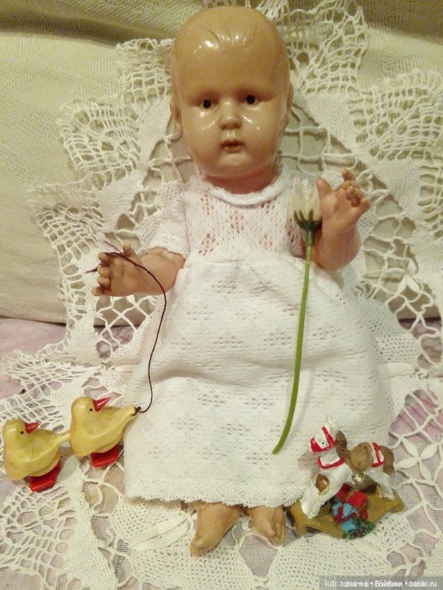 А я вот касаемо платьев сама вчера была в полном недоумении! Мне несколько лет назад подруга подарила очень старую довоенную целлулоидную куклу в платье.Скину фото ниже.Про эту куклу аж 2 топика написала-она редкая весьма.Так вот на ней было платье, я, честно, думала, что оно самопошитое.Той кукле сшила абсолютно другой костюм, платье убрала в закрома.Недавно достала как раз в нём героиню топика и вырядила.А тут вчера листаю шопик и вижу это же платье на кукле в 40см у Жанны из Бургаса.Каково ж моё удивление)))Честно, даже ради платья чуть было не купила эту куклу