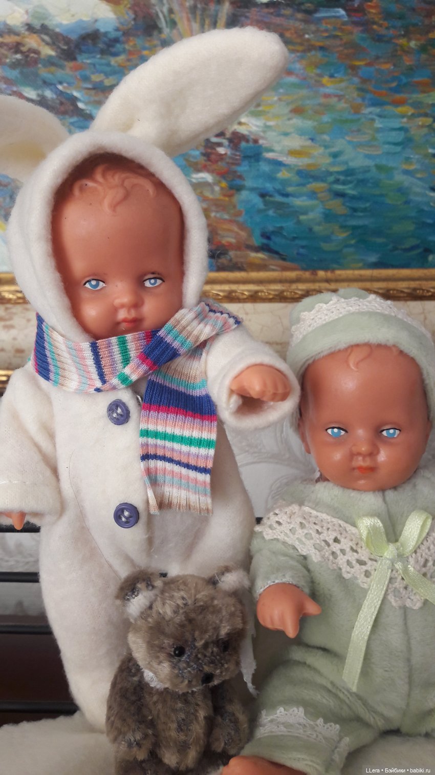 А, что касается резины, то да само собой — это время! Мой Тебу в голубом — ранний и она потемнее, чем резина голубоглазой девочки в желтом, она и была куплена на пару лет попозже. А Либу из разной резины — в лаймовом комбезике с уточкой он из детства — персиковый цвет резин, а второго я уже купила лет 7-мь назад, он из позднех выпусков — резина там и была темная -загореленький такой ребенок!