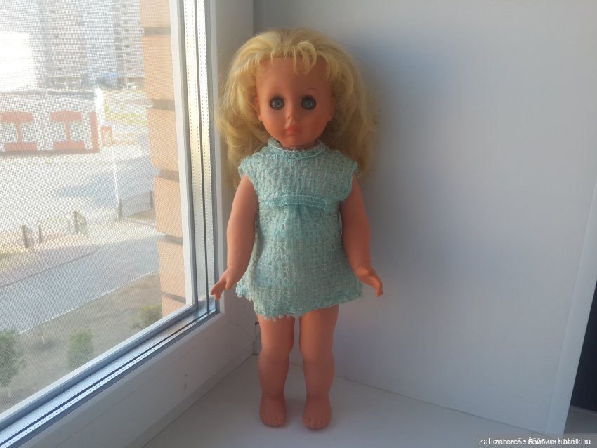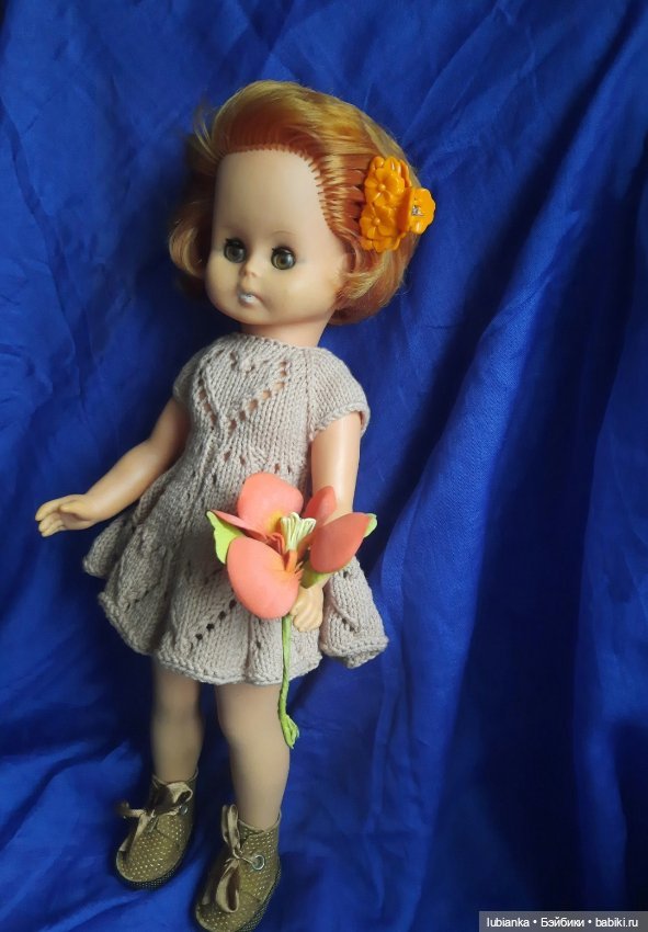 Далее всё банально просто:45 см роста, виниловое всё, кроме тела.Прошивка волос интересная-как бы из центра они идут.Бирюзоватого цвета глаза, курносый нос… в волосах только 45…