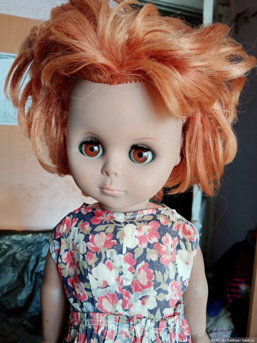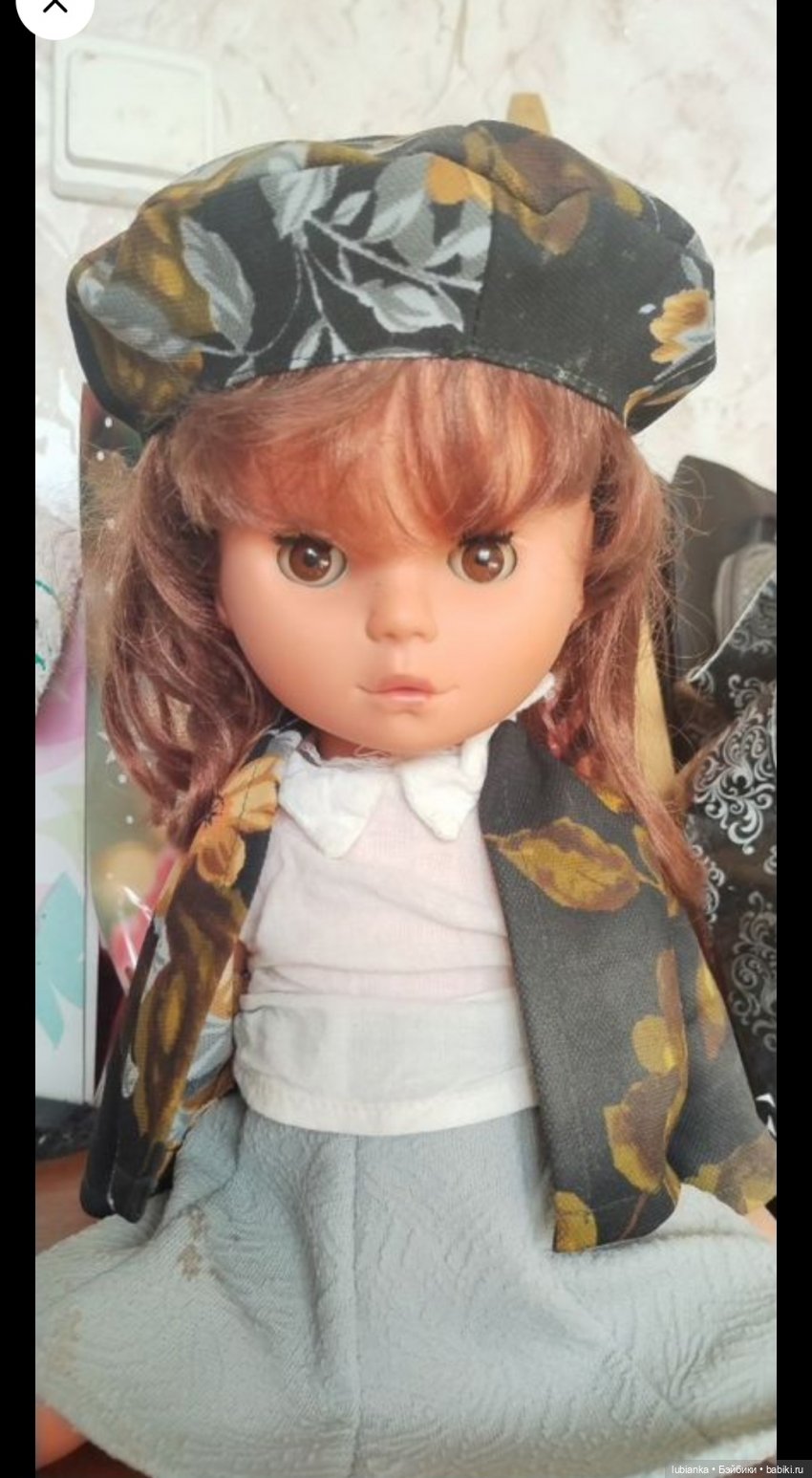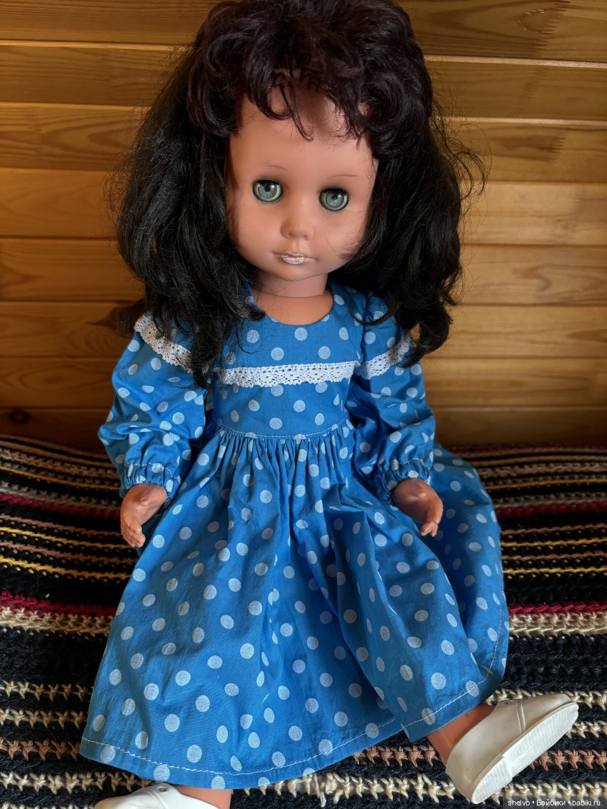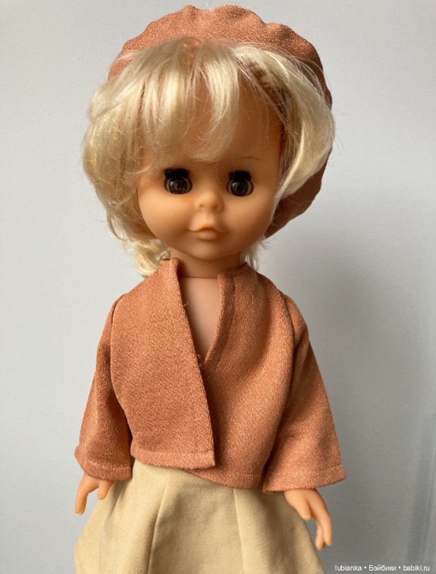 Она целиком из резины, подвижная такая,45см ростом.Волосы -баклажановая густая роскошь!:)Костюмчик кримпленовый «с искоркой» в стиле 70х при ней и к тому же сидит 😊Только брошечку ей подарила из закромов своих.