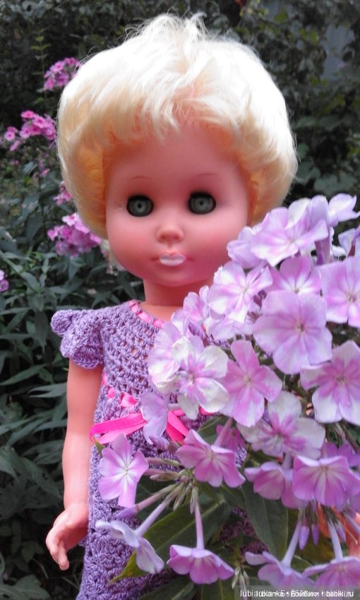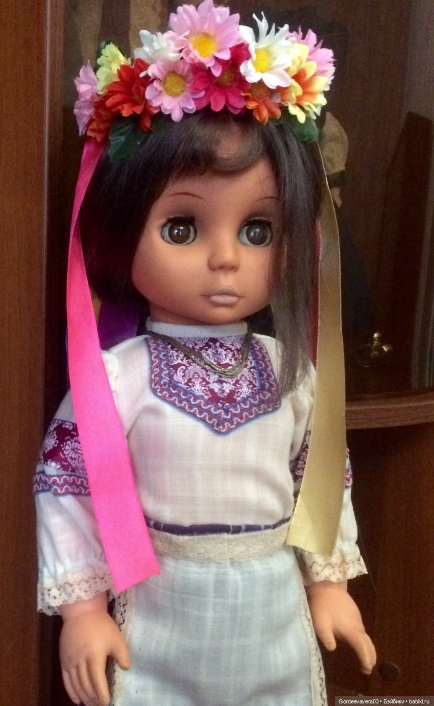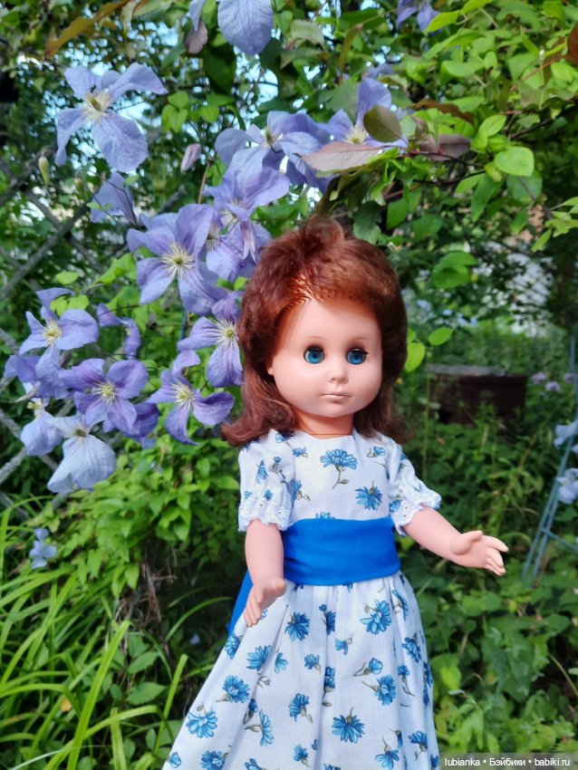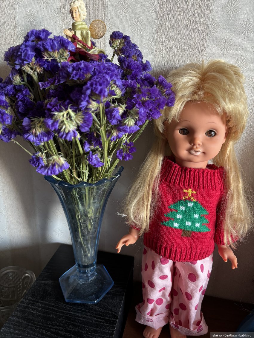 Она целиком из резины, подвижная такая,45см ростом.Волосы -баклажановая густая роскошь!:)Костюмчик кримпленовый «с искоркой» в стиле 70х при ней и к тому же сидит 😊Только брошечку ей подарила из закромов своих.
