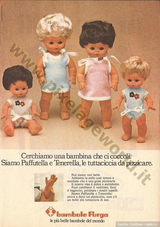 Наощупь он мне больше всего напомнил линолеум (муахаха!). Он мягкий, очень гладкий. Совсем не похож на тот винил, из которого выполнены другие винтажные куклы, ни на итальянок, ни на немок. Пожалуй, ближе всего Пататина от Sebino, 60х годов выпуска. Тело у нее мягконабивное, а ручки-ножки-голова виниловые.