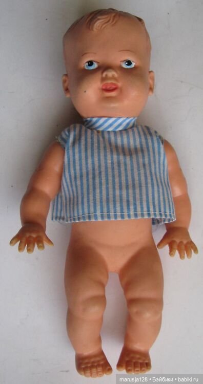 При надавливании материал прогибается, но будто бы кукла не полая (такое же ощущение при надавливании на ручку и ножку Пататины, но она менее гладкая). Голову снимать и проверять я не стала, она сидит очень плотно, побоялась повредить необычный материал тельца, все таки ему много лет и следы времени могли сказаться как угодно.
