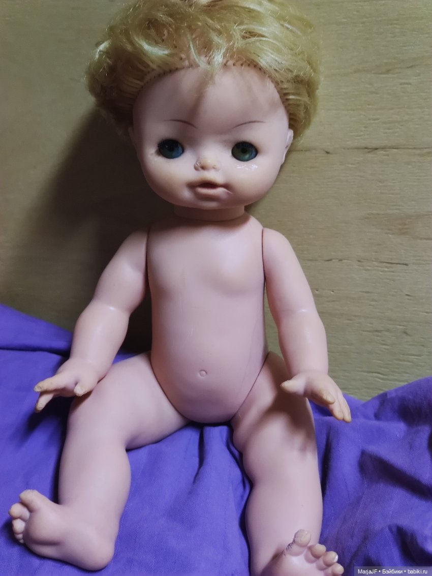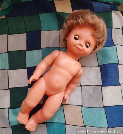 Встретились вчера в метро«ВДНХ», я даже не стала смотреть(а зря!!! урок получила!), схватила и помчалась домой.По дороге уже меня нахлобучило, ибо всё ж залезла в пакет то… Вчера даже мыть её не стала… Хотела заказать ей яркое бирюзовое платье… Потом передумала.30см.Тело 1:1 от поздних сердиток Эрнстрод.Кстати куклу продавала первая хозяйка, ей её подарили в1979г.и, конечно, костюмчик уцелел родной.Грудничковый костюмчик на взрослой тёте-это так по-ихнему😏