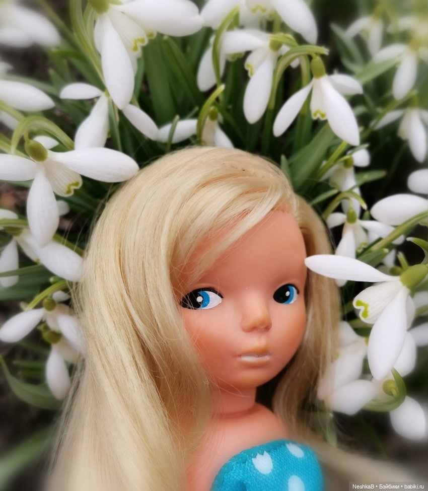Когда кукла в движении, она выглядит энергичной и волевой девчонкой. Смешная. Нравится мне она. Среди других кукол очень выделяется и цветом лица, и пшеничным цветом волос, и косящим взглядом, говорящим: «Что вы, малышня, вообще знаете о жизни?» 😄