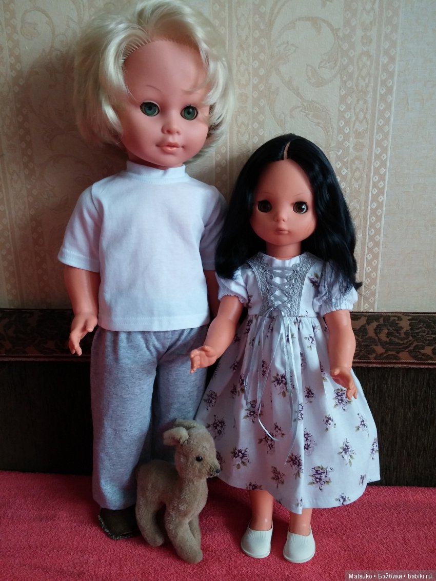 Что-то у нас «разлад» в стиле одежды у девочек. Надо переодеть Эру, чтобы сестре соответствовала. А переодевания у девочек всегда на ура проходят. Выручила Эру Женечка, тоже кукла ГДР: одолжила ей платье, в котором приехала когда-то.