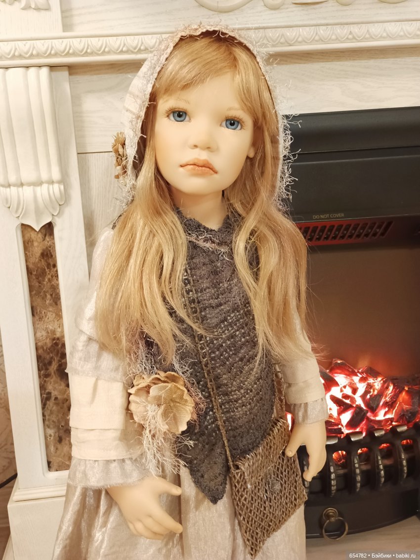 Богатый аутфит, натуральные волосы, стеклянные глаза. В теле так же есть скелетный каркас, что позволяет менять положение рук и ног.