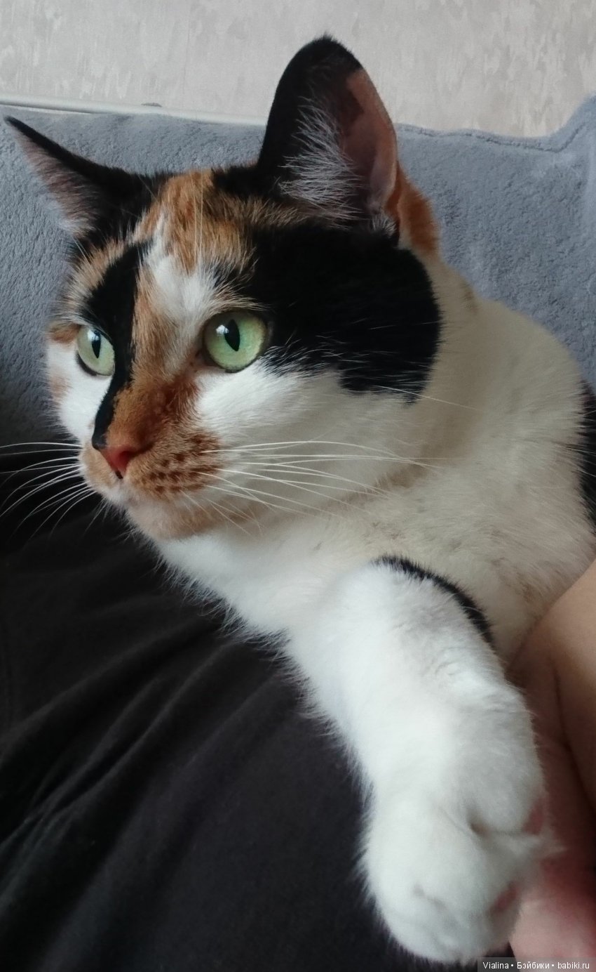 Дусенька — девушка с характером — кокетничает, заигрывает, а может, при случае, и обидиться) Утончённая натура с очаровательной внешностью. Как и каждая порядочная разношёрстная кошка, приносит удачу и массу позитивных эмоций) Очень любит подарки (Вкусняшки, игрушки), а также ласку. Хорошо чувствует людей, не даётся погладить каждому. Но если человек ей понравится — то может и на коленочках полежать, и помурчать, и массаж сделать)